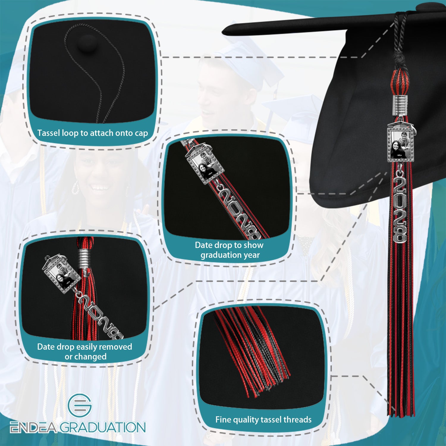 Black/Red Tassel with Photo Frame Charm and Stacked Date Drop
