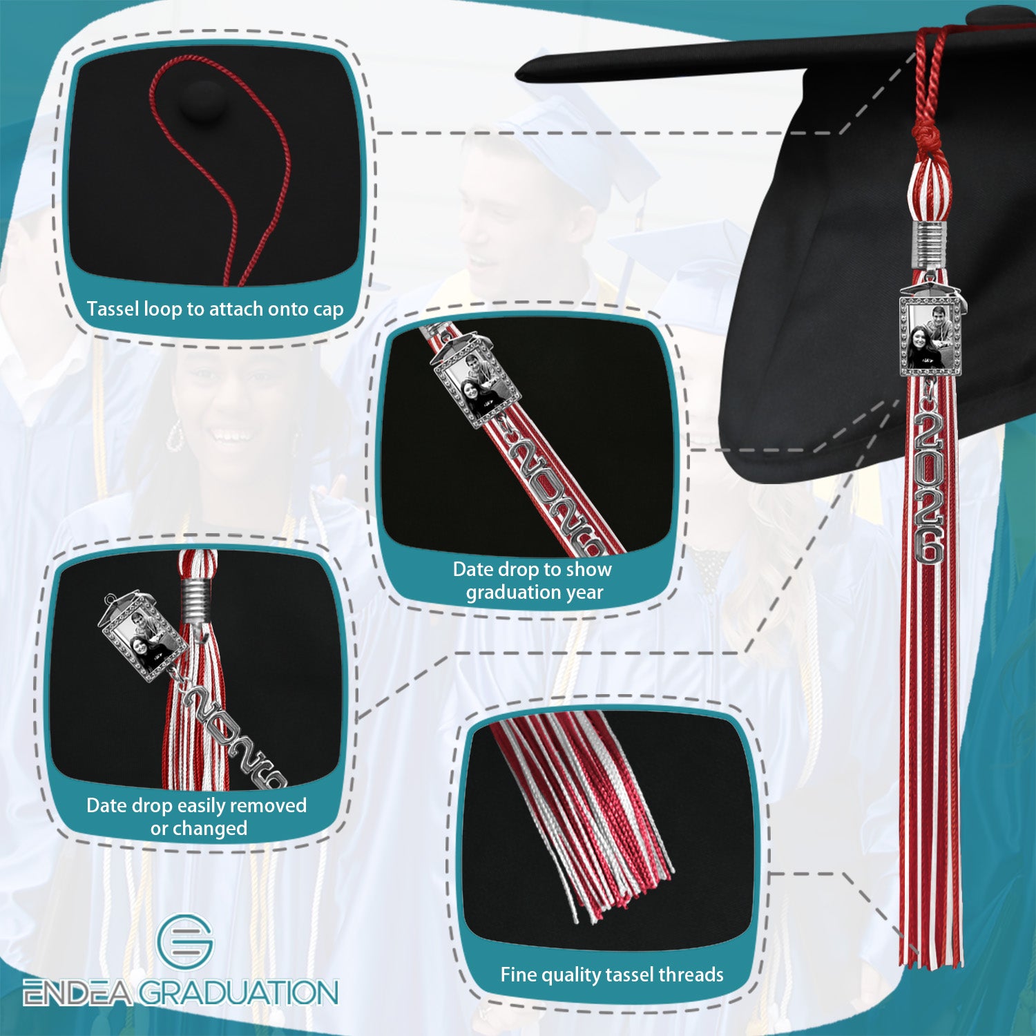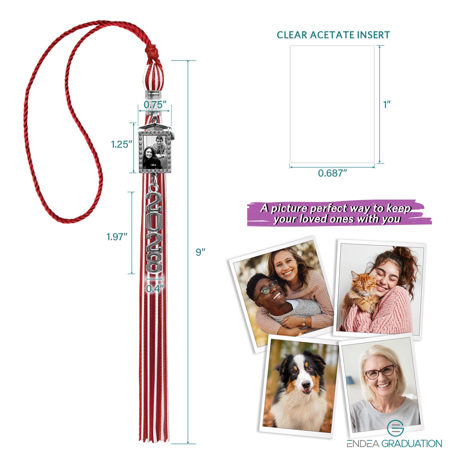 The Tassels with Photo Charms - Stacked Charm is the perfect way to commemorate your graduation with a personalized, meaningful touch. This elegant tassel is designed to hold a photo measuring 1” by 0.7”, allowing you to display a cherished memory or special image on your graduation day. The tassel itself measures 9 inches in length, the standard size used for graduation ceremonies at all educational levels throughout the United States. Crafted with precision and attention to detail, this tassel is both a functional accessory and a lasting keepsake. Whether you are graduating from high school, college, or university, this photo charm tassel provides a unique way to celebrate your academic achievement while adding a personal flair to your ceremony attire.