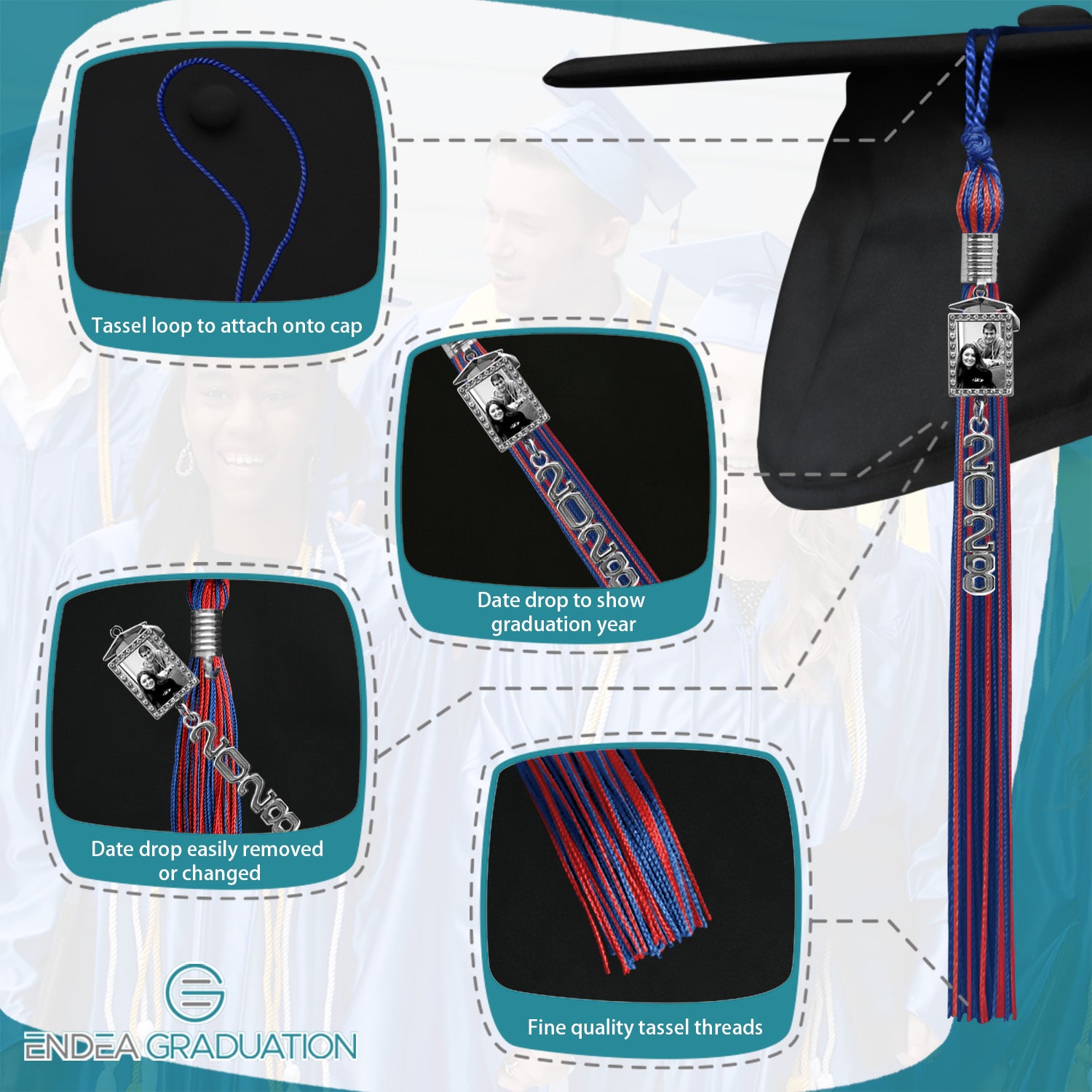 Royal Blue/Red Tassel with Photo Frame Charm and Stacked Date Drop