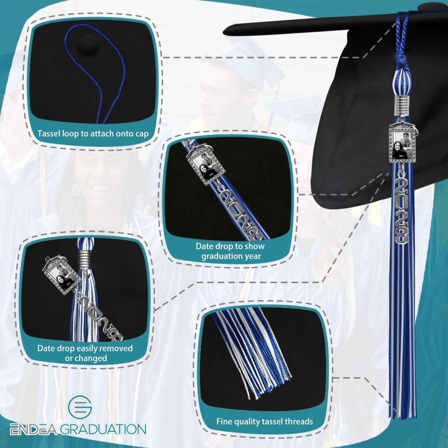 Royal Blue/White Tassel with Photo Frame Charm and Stacked Date Drop