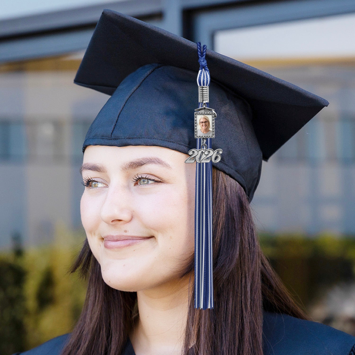 Photo Charm Frame: Designed to display a 1” x 0.7” photo, offering a unique way to personalize your graduation attire.