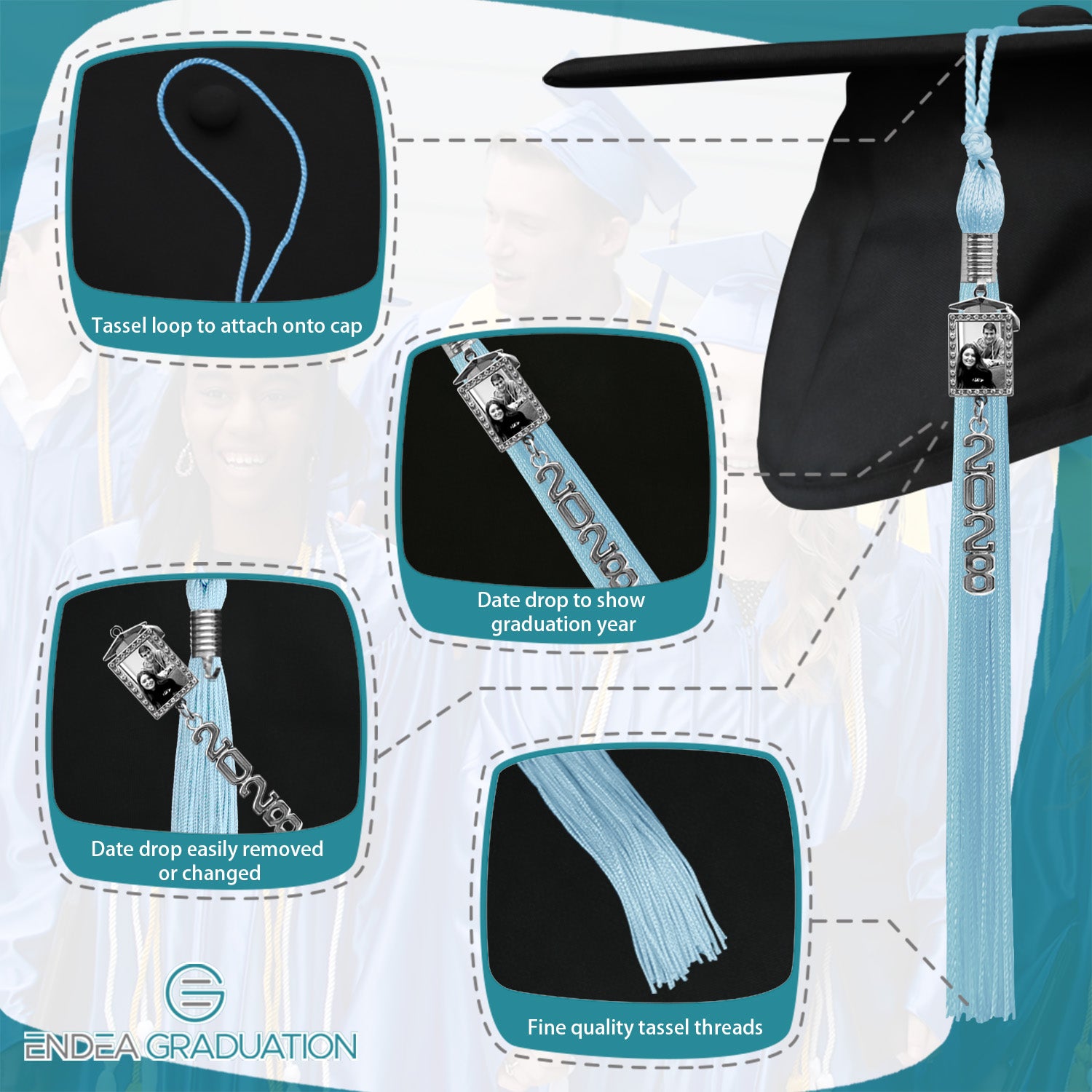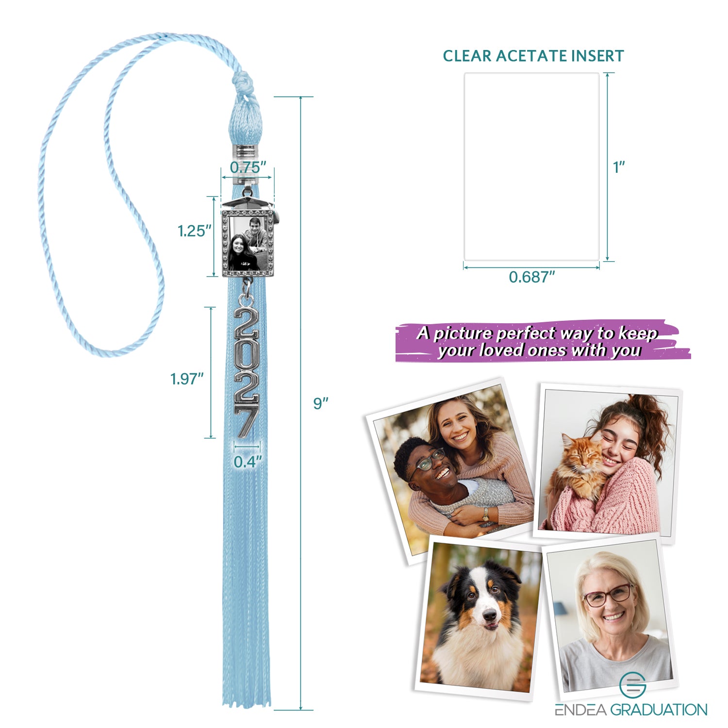 The Tassels with Photo Charms - Stacked Charm is the perfect way to commemorate your graduation with a personalized, meaningful touch. This elegant tassel is designed to hold a photo measuring 1” by 0.7”, allowing you to display a cherished memory or special image on your graduation day. The tassel itself measures 9 inches in length, the standard size used for graduation ceremonies at all educational levels throughout the United States. Crafted with precision and attention to detail, this tassel is both a functional accessory and a lasting keepsake. Whether you are graduating from high school, college, or university, this photo charm tassel provides a unique way to celebrate your academic achievement while adding a personal flair to your ceremony attire.