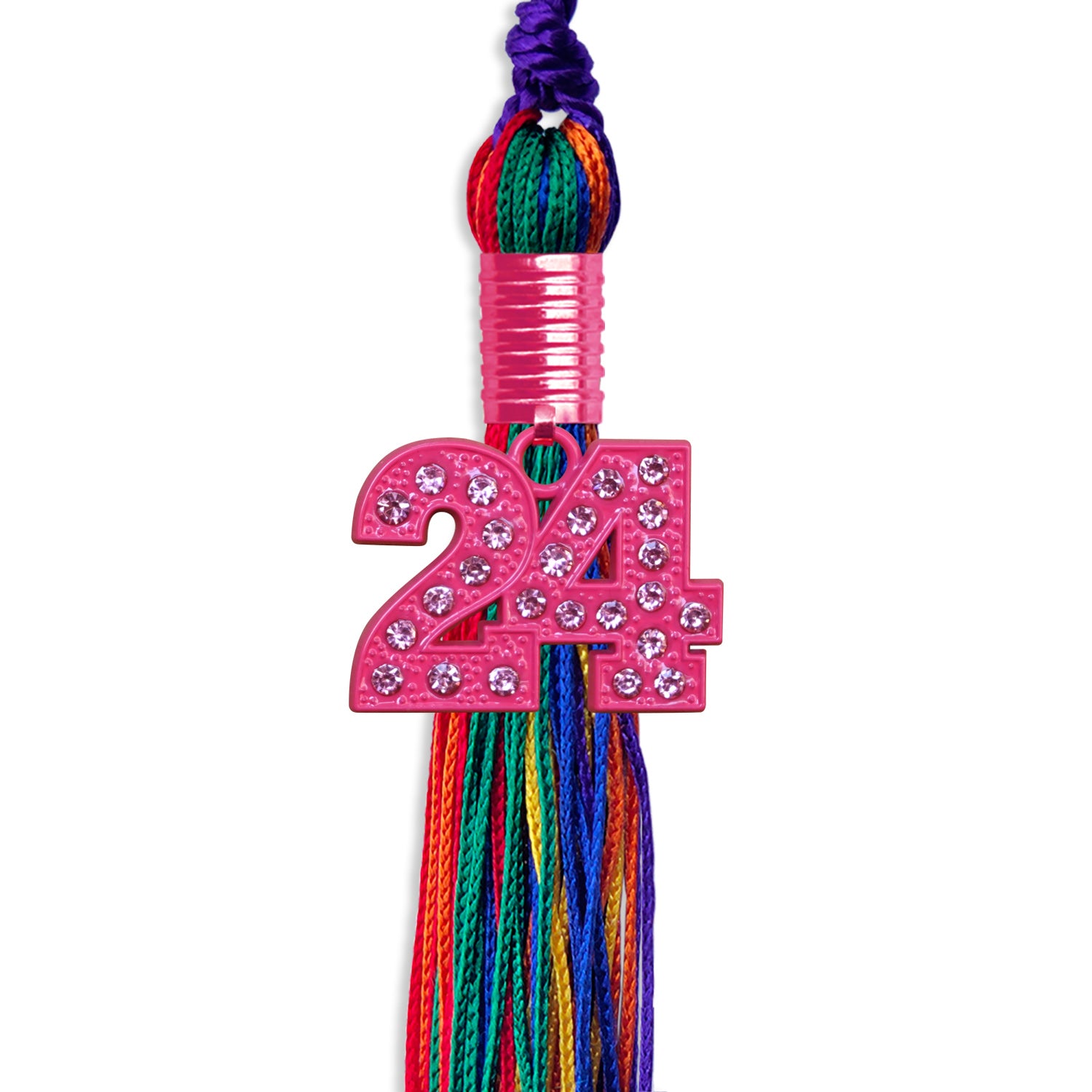 Celebrate your graduation with flair and style using the Mixed Color Tassel with Pink Bling Charm. This tassel features a gorgeous mix of colors, including vibrant pink, that adds a lively and dynamic touch to your cap and gown. The stunning pink bling charm catches the light and adds an extra layer of sparkle, making you the center of attention on your special day. Crafted from high-quality, durable threads, this tassel measures 9 inches in length, with a 6 1/2" hang loop for easy attachment to your cap. Whether you're graduating from high school or college, this tassel is a perfect accessory to help you celebrate your achievements and capture stunning graduation photos.