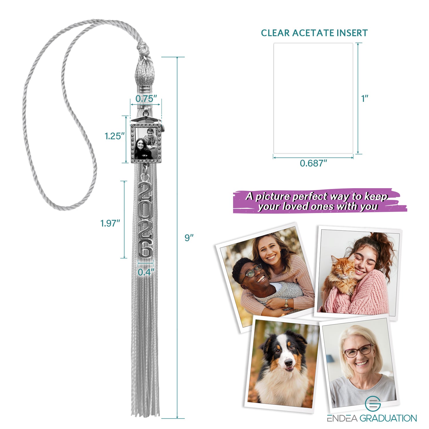 The Tassels with Photo Charms - Stacked Charm is the perfect way to commemorate your graduation with a personalized, meaningful touch. This elegant tassel is designed to hold a photo measuring 1” by 0.7”, allowing you to display a cherished memory or special image on your graduation day. The tassel itself measures 9 inches in length, the standard size used for graduation ceremonies at all educational levels throughout the United States. Crafted with precision and attention to detail, this tassel is both a functional accessory and a lasting keepsake. Whether you are graduating from high school, college, or university, this photo charm tassel provides a unique way to celebrate your academic achievement while adding a personal flair to your ceremony attire.