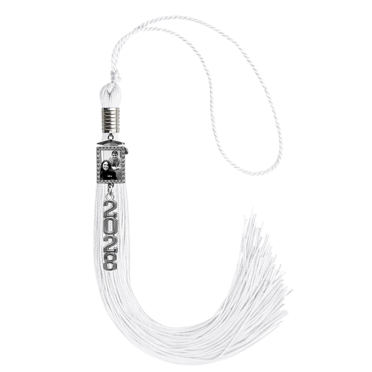The Tassels with Photo Charms - Stacked Charm is the perfect way to commemorate your graduation with a personalized, meaningful touch. This elegant tassel is designed to hold a photo measuring 1” by 0.7”, allowing you to display a cherished memory or special image on your graduation day. The tassel itself measures 9 inches in length, the standard size used for graduation ceremonies at all educational levels throughout the United States. Crafted with precision and attention to detail, this tassel is both a functional accessory and a lasting keepsake. Whether you are graduating from high school, college, or university, this photo charm tassel provides a unique way to celebrate your academic achievement while adding a personal flair to your ceremony attire.